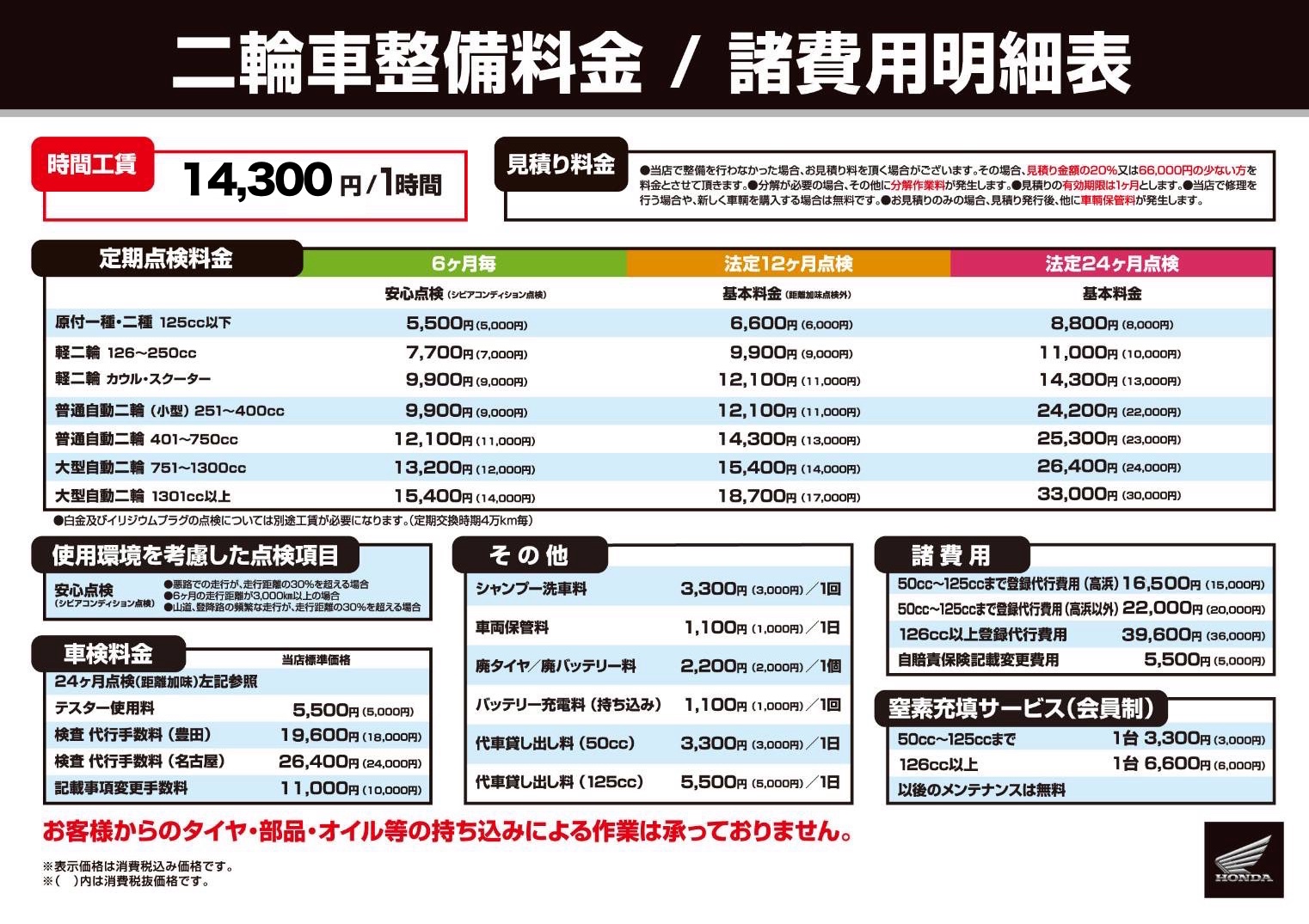 ※点検時に別途必要な整備が発生した場合は、部品・油脂類の代金および工賃は別途申し受けます。